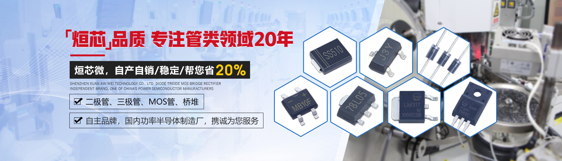 進(jìn)口的生產(chǎn)設(shè)備與測試設(shè)備,成熟的生產(chǎn)流程,保證著二極管、三極管、MOS管、橋堆的性能穩(wěn)定、壽命長!